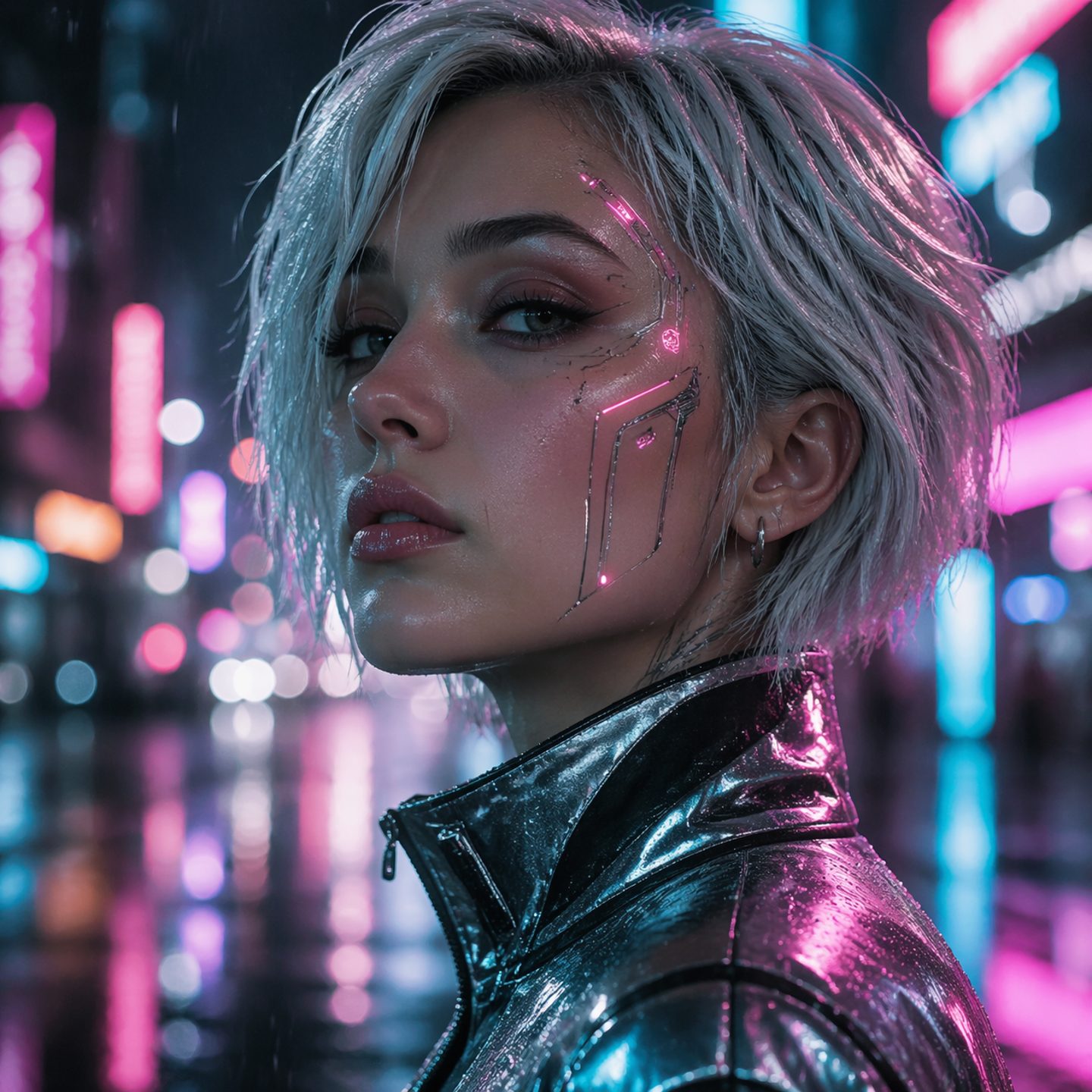 A close-up portrait of a woman with short silver hair in a rain-soaked cyberpunk city at night. Neon signs in pink and teal reflect off wet surfaces and her metallic jacket. Futuristic face implants glow softly beneath the skin. Shot with a wide-aperture lens, bokeh of city lights in the background.