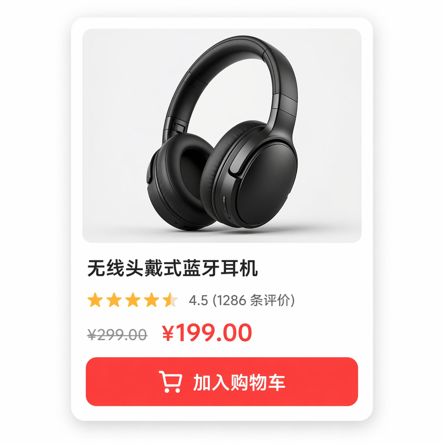 A modern e-commerce product card component design. White card with subtle shadow, product image at top (wireless headphones on a clean background), below: product name in medium-weight sans-serif, star rating (4.5 stars) with review count, original price crossed out with sale price in red, and an 'Add to Cart' button with shopping cart icon. Hover state shows a subtle scale-up and shadow increase.