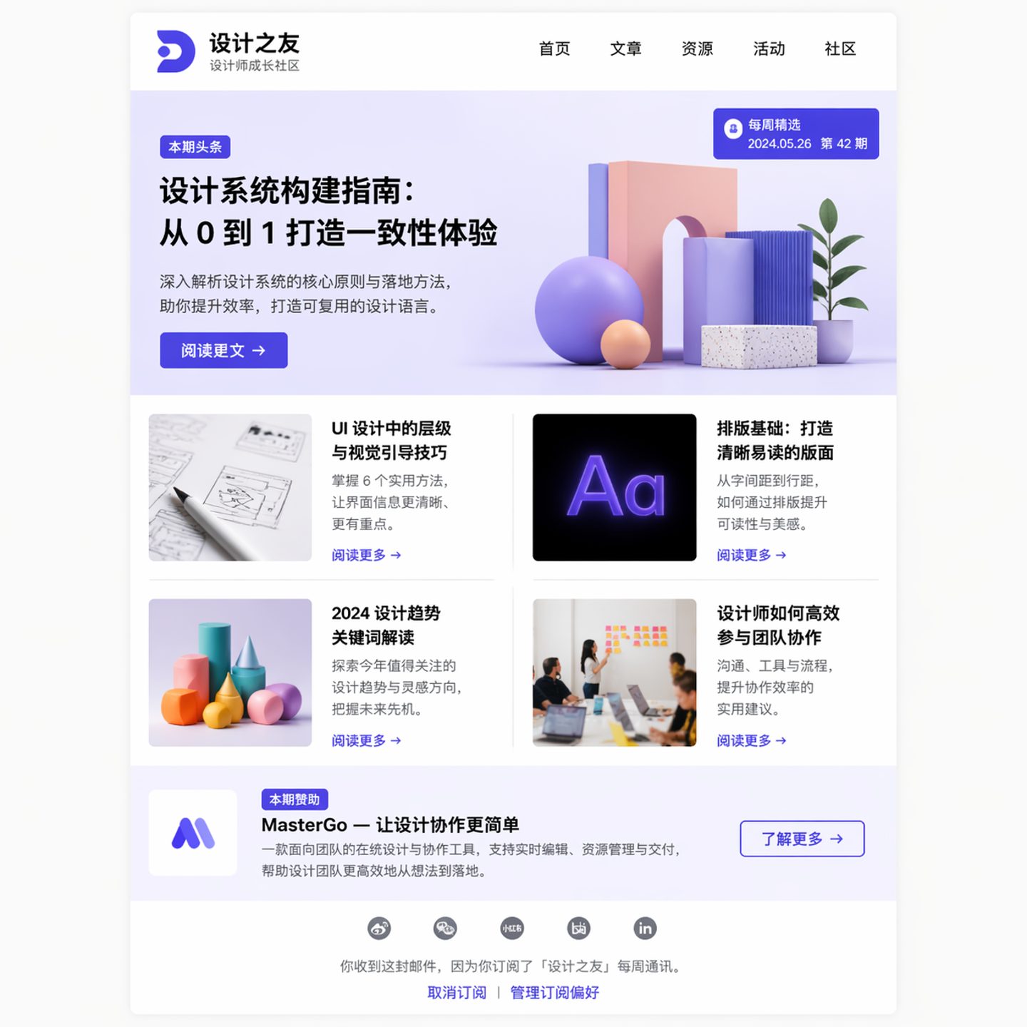 A weekly newsletter email template for a design community. Header with logo and navigation links. Hero section: large image with overlay text for the featured article. Below: a 2-column grid of article cards with thumbnails, titles, and 'Read more' links. Sponsor section with a subtle background tint. Footer with social icons and unsubscribe link. Max width 600px, clean and scannable.
