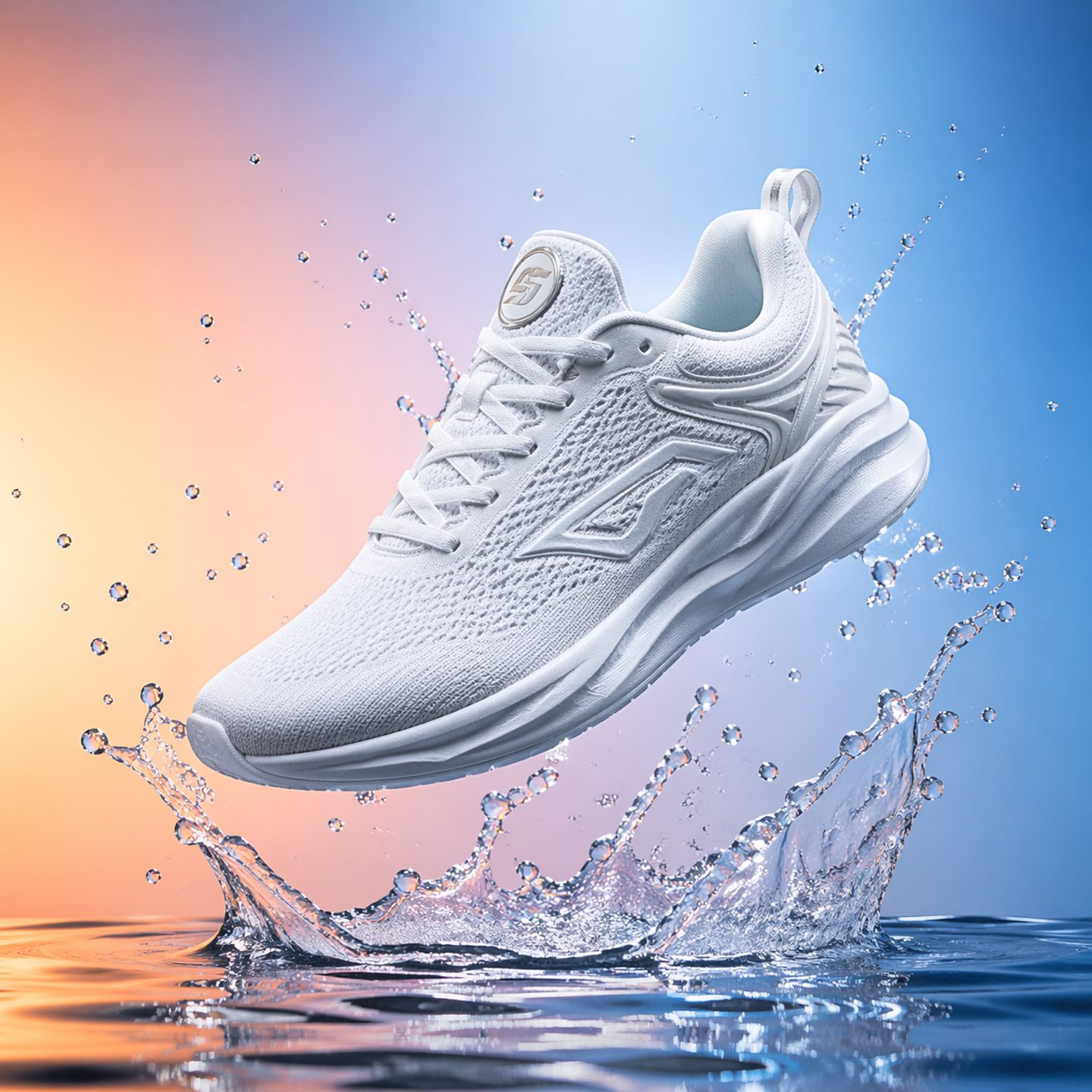 A dramatic product photograph of a white sneaker floating above a shallow pool of water. Water droplets frozen mid-splash around the shoe. Gradient studio background transitioning from warm peach to cool blue. Professional product lighting: key light from above, fill light from the left, rim light creating a halo effect. Ultra-sharp detail, commercial advertising quality.