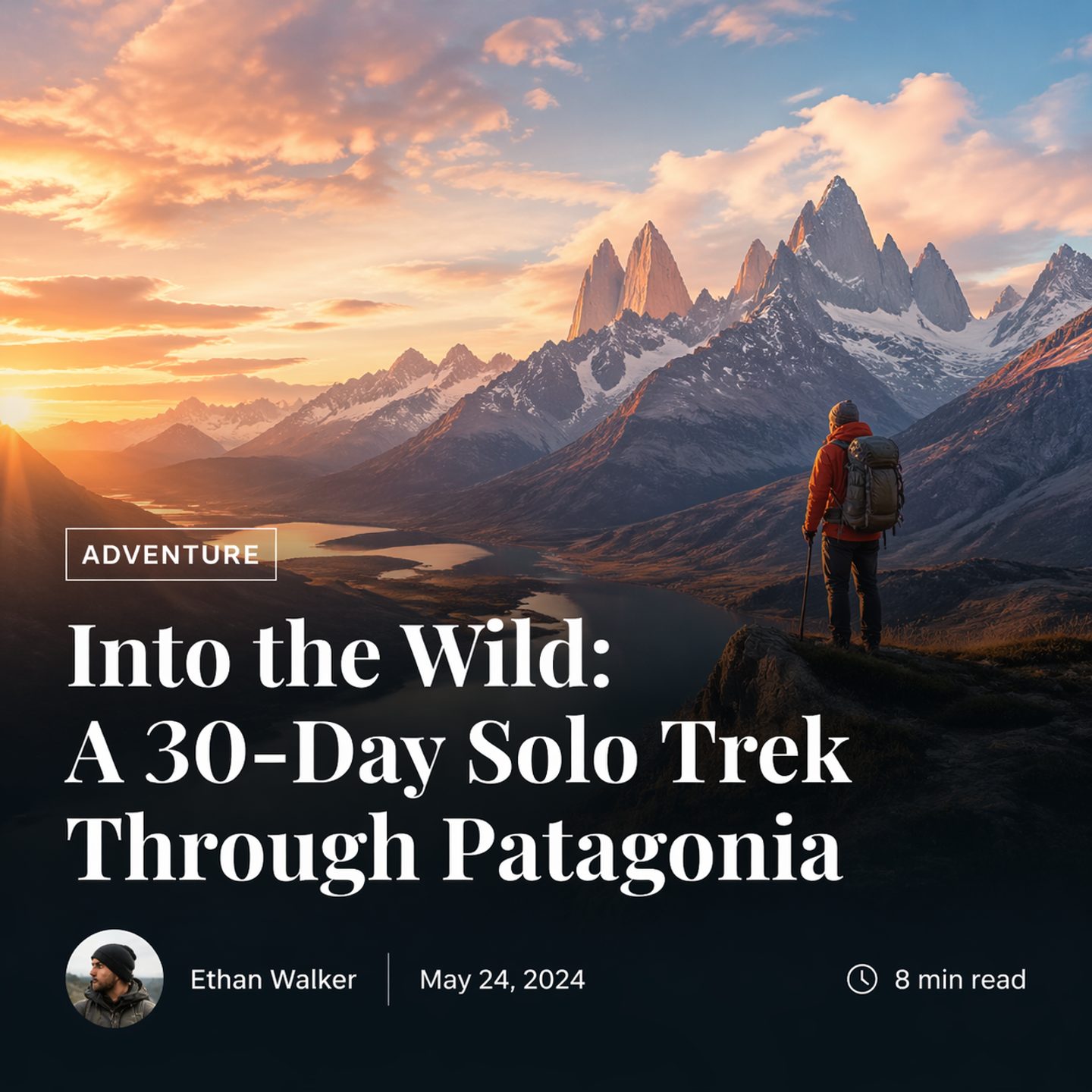 A blog article hero section with a full-width cover image of a mountain landscape at sunrise. Overlay gradient from transparent to dark at the bottom. White text overlay: category tag 'ADVENTURE', large serif headline 'Into the Wild: A 30-Day Solo Trek Through Patagonia', author avatar with name and date, estimated reading time. Clean, editorial design with generous spacing.