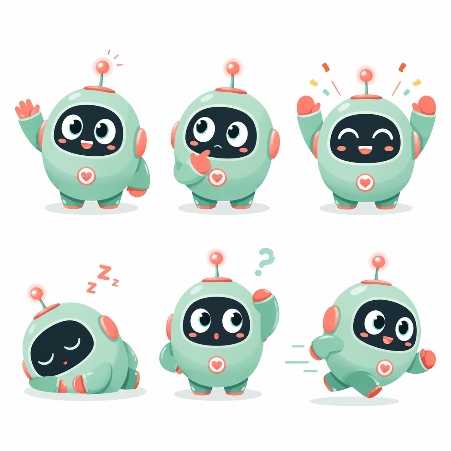 A cute mascot character design of a round, chubby robot with a glowing antenna, tiny stubby legs, and oversized expressive eyes. Color scheme: mint green body with coral accents. Shown in 6 different poses: waving, thinking, celebrating, sleeping, confused, and running. Flat vector style with simple shading, suitable for app icons and stickers.