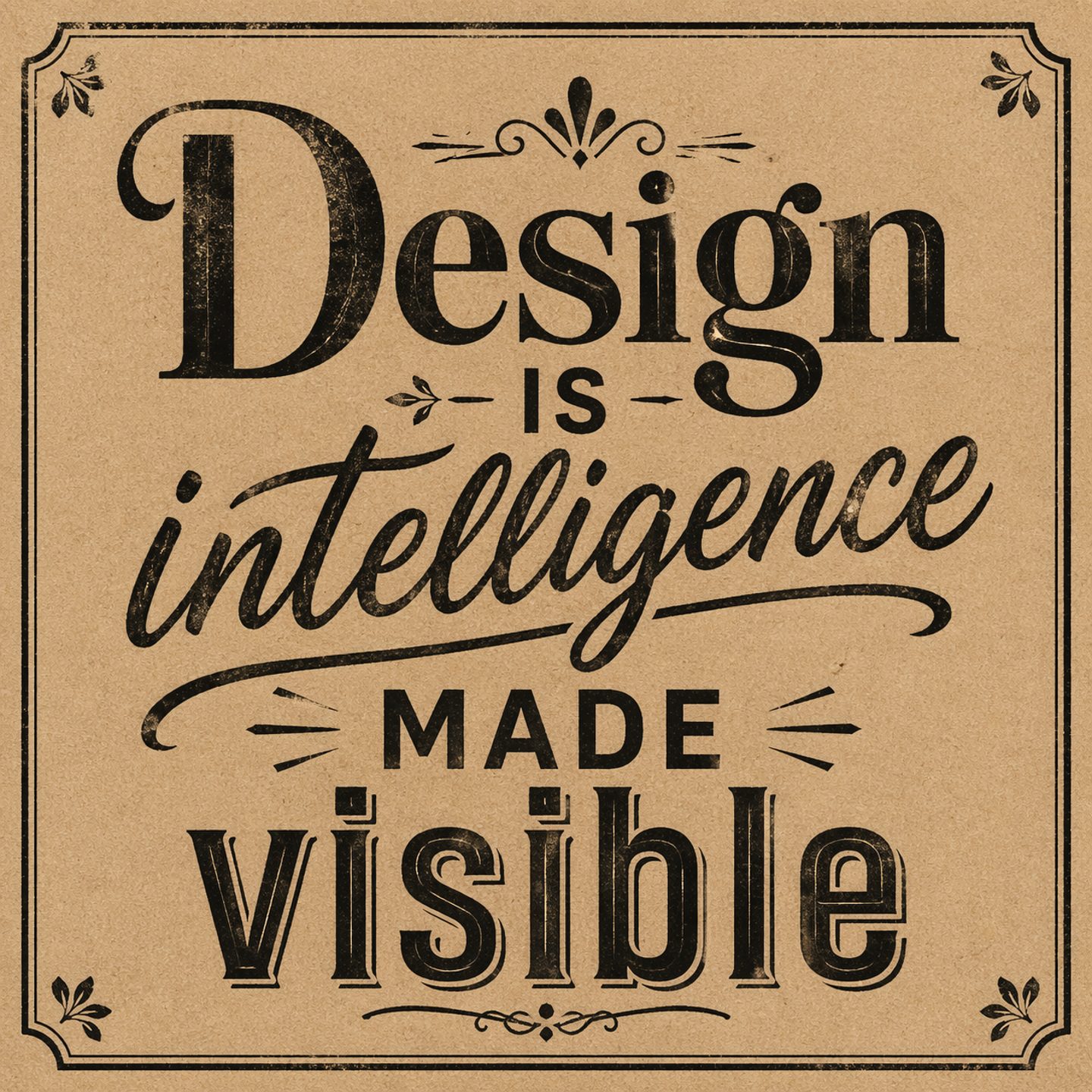 A hand-lettered typography poster with the quote 'Design is intelligence made visible'. Mix of serif, script, and sans-serif letterforms, each word in a different style but harmoniously composed. Black ink on kraft paper texture, with small decorative flourishes and a thin border frame. Vintage letterpress aesthetic, imperfect ink coverage adding character.
