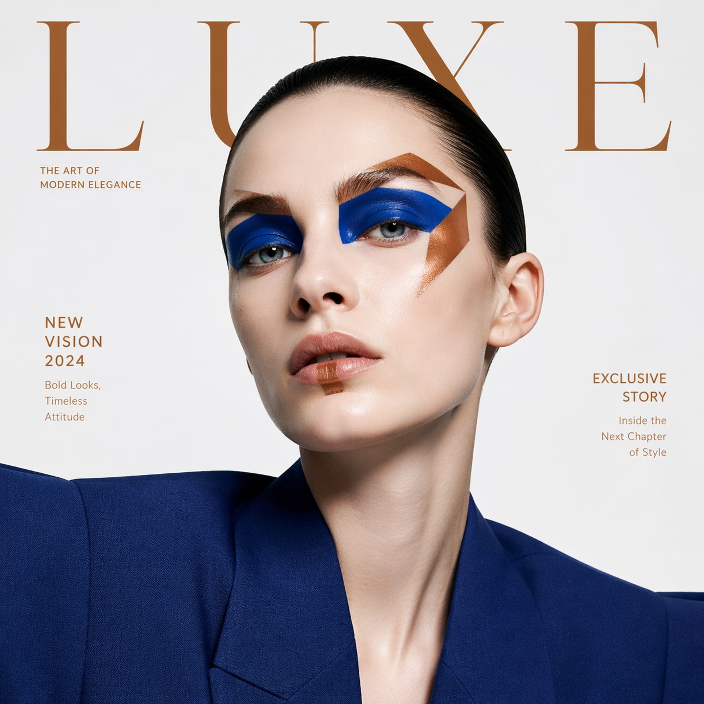 A high-fashion editorial portrait for a luxury magazine cover. A model with bold geometric makeup in cobalt blue and copper, wearing an oversized structured blazer. Stark white studio background, ring light reflections visible in the eyes, ultra-sharp detail. Shot at f/2.8 on a medium-format digital camera.