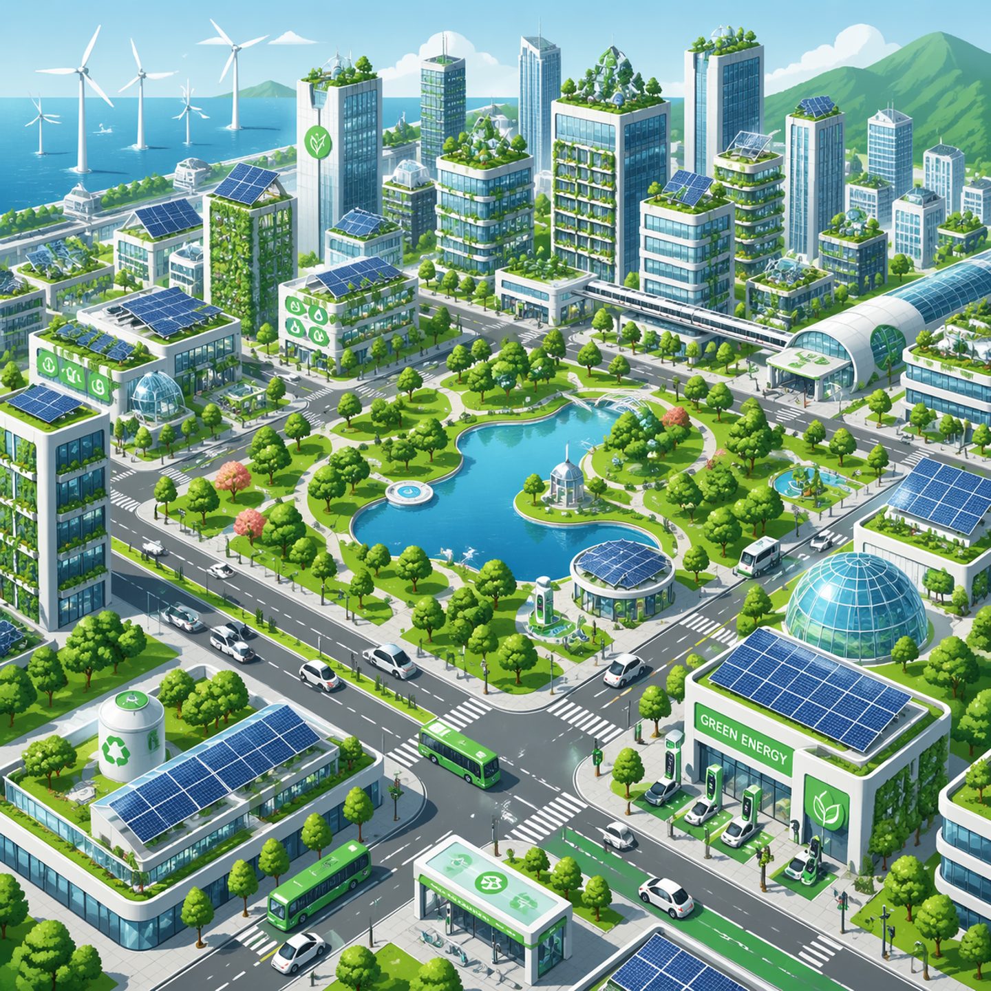A detailed isometric illustration of a futuristic sustainable city. Solar-panel rooftops, vertical gardens on buildings, electric vehicles on streets, wind turbines in the distance, and a central park with a lake. Bright, optimistic color palette with soft shadows. Clean vector-style rendering with subtle textures. No people, focus on architecture and infrastructure.