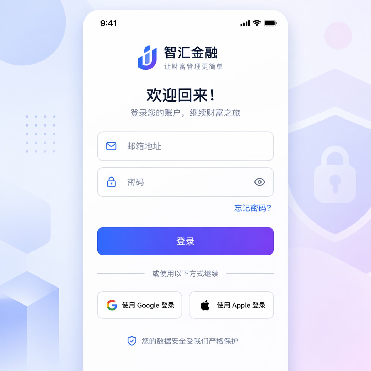 A mobile login screen for a fintech app. At the top: app logo and 'Welcome back' greeting. Two input fields with icons (email and password) with rounded borders, a 'Forgot password?' link aligned right, a full-width gradient 'Sign In' button, an 'or continue with' divider, and social login buttons (Google, Apple) side by side. Soft pastel background with subtle geometric shapes. Modern and secure-feeling.