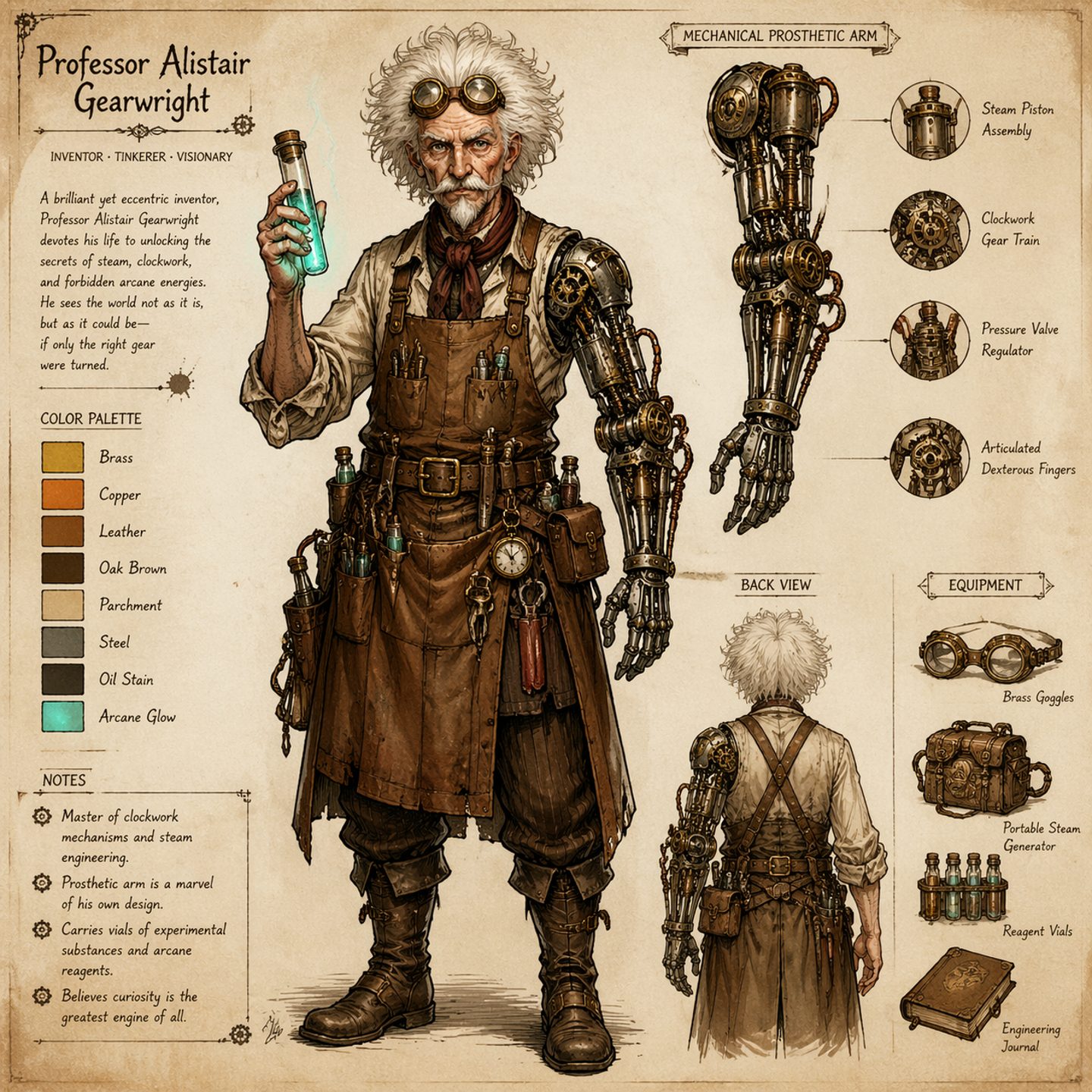 A character concept for a steampunk inventor: a wiry old man with wild white hair, brass goggles pushed up on his forehead, a leather apron covered in tool loops, and a mechanical prosthetic arm with visible gears and pistons. He holds a glowing vial in one hand. Warm sepia and copper tones, detailed ink-and-wash illustration style. Front view with color callouts.